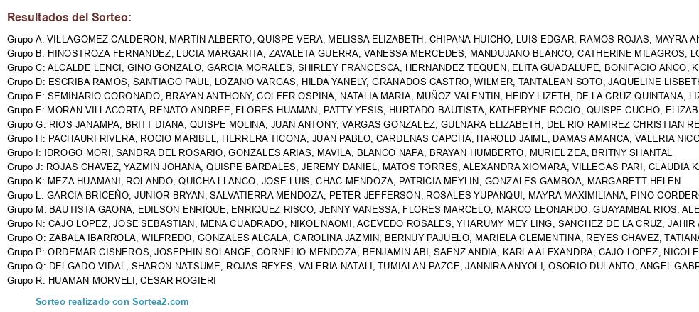 Lista de participantes: ACEVEDO ROSALES, YHARUMY MEY LING, ALCALDE LENCI, GINO GONZALO, BAUTISTA GAONA, EDILSON ENRIQUE, BERNUY PAJUELO, MARIELA CLEMENTINA, BLANCO NAPA, BRAYAN HUMBERTO, BONIFACIO ANCO, KRISTELL DANIELLI, CAJO LOPEZ, JOSE SEBASTIAN, CAJO LOPEZ, NICOLE, CARDENAS CAPCHA, HAROLD JAIME, CHAC MENDOZA, PATRICIA MEYLIN, CHIPANA HUICHO, LUIS EDGAR, COLFER OSPINA, NATALIA MARIA, CORNELIO MENDOZA, BENJAMIN ABI, DAMAS AMANCA, VALERIA NICOLL, DE LA CRUZ QUINTANA, LIZBETH ELVIRA, DEL RIO RAMIREZ CHRISTIAN RENZO, DELGADO VIDAL, SHARON NATSUME, ENRIQUEZ RISCO, JENNY VANESSA, ESCRIBA RAMOS, SANTIAGO PAUL, FLORES HUAMAN, PATTY YESIS, FLORES MARCELO, MARCO LEONARDO, GARCIA BRICEÑO, JUNIOR BRYAN, GARCIA MORALES, SHIRLEY FRANCESCA, GONZALES ALCALA, CAROLINA JAZMIN, GONZALES ARIAS, MAVILA, GONZALES GAMBOA, MARGARETT HELEN, GRANADOS CASTRO, WILMER, GUAYAMBAL RIOS, ALEXANDER JOEL, HERNANDEZ TEQUEN, ELITA GUADALUPE, HERRERA TICONA, JUAN PABLO, HINOSTROZA FERNANDEZ, LUCIA MARGARITA, HUAMAN MORVELI, CESAR ROGIERI, HURTADO BAUTISTA, KATHERYNE ROCIO, IDROGO MORI, SANDRA DEL ROSARIO, LOPEZ CANCHO, ROBERTH RUBEN, LOZANO VARGAS, HILDA YANELY, MANDUJANO BLANCO, CATHERINE MILAGROS, MATOS TORRES, ALEXANDRA XIOMARA, MENA CUADRADO, NIKOL NAOMI, MEZA HUAMANI, ROLANDO, MORAN VILLACORTA, RENATO ANDREE, MUÑOZ VALENTIN, HEIDY LIZETH, MURIEL ZEA, BRITNY SHANTAL, ORDEMAR CISNEROS, JOSEPHIN SOLANGE, OSORIO DULANTO, ANGEL GABRIEL, PACHAURI RIVERA, ROCIO MARIBEL, PINO CORDERO, JOSHUA RAFAEL, QUICHA LLANCO, JOSE LUIS, QUISPE BARDALES, JEREMY DANIEL, QUISPE CUCHO, ELIZABETH, QUISPE MOLINA, JUAN ANTONY, QUISPE VERA, MELISSA ELIZABETH, RAMOS ROJAS, MAYRA ANALI, REYES CHAVEZ, TATIANA ANDREA, RIOS JANAMPA, BRITT DIANA, ROJAS CHAVEZ, YAZMIN JOHANA, ROJAS REYES, VALERIA NATALI, ROSALES YUPANQUI, MAYRA MAXIMILIANA, SAENZ ANDIA, KARLA ALEXANDRA, SALVATIERRA MENDOZA, PETER JEFFERSON, SANCHEZ DE LA CRUZ, JAHIR ADOLFO, SEMINARIO CORONADO, BRAYAN ANTHONY, TANTALEAN SOTO, JAQUELINE LISBETH, TUMIALAN PAZCE, JANNIRA ANYOLI, VARGAS GONZALEZ, GULNARA ELIZABETH, VILLAGOMEZ CALDERON, MARTIN ALBERTO, VILLEGAS PARI, CLAUDIA KAROLINA, ZABALA IBARROLA, WILFREDO, ZAVALETA GUERRA, VANESSA MERCEDES.