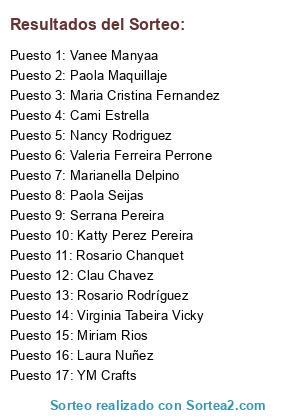 Lista de participantes: Rosario Chanquet, Cami Estrella, Nancy Rodriguez, Maria Cristina Fernandez, Serrana Pereira, Clau Chavez, Paola Seijas, Valeria Ferreira Perrone, Vanee Manyaa, Miriam Rios, YM Crafts, Marianella Delpino, Katty Perez Pereira, Lena Chuda, Virginia Tabeira Vicky, Paola Maquillaje, Laura Nuñez.