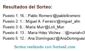 Lista de participantes: 1. Miguel A. Ferreiro @miguel_afm, 2. JosanM @SrMadyolo, 3. Néstor M. García @NestorMGH, 4. Migue @BareaMigue, 5. ByCleo @By_Cleo_, 6. María Mun @Loli_Mun, 7. Alberto Velardiez @velardiez_alber, 8. ~,.-_ @SSphipersonae, 9. The beast @GundamStrikeX, 10. Javier Palomo @javierpal_f, 11. Unlucky Aizen Senpai @Aizenoso, 12. Ana Domínguez @AnaDomnguez9, 13. Maria Hdez Vilches ♛ @mariahv36, 14. Manuel Toro Galea @torogalea, 15. Rubén de Joaquín @rubdesal, 16. Pablo Romero @pablo6romero, 17. Morales @PhisyAndMe.