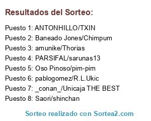 Lista de participantes: ANTONHILLO/TXIN, Oso Pinoso/pim-pim, amunike/Thorias, Baneado Jones/Chimpum, pablogomez/R.L.Ukic, _conan_/Unicaja THE BEST, Saori/shinchan, PARSIFAL/sarunas13.