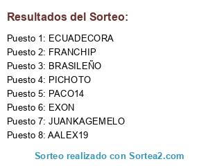 Lista de participantes: PICHOTO, PACO14, ECUADECORA, AALEX19, BRASILEÑO, JUANKAGEMELO, EXON, FRANCHIP.