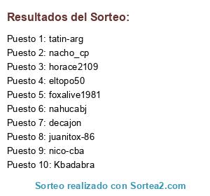 Lista de participantes: tatin-arg, nacho_cp, nahucabj, Kbadabra, eltopo50, decajon, nico-cba, juanitox-86, horace2109, foxalive1981.