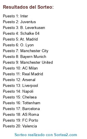 Lista de participantes: AC Milan, Arsenal, AS Roma, At. Madrid, B. Leverkusen, Barcelona, Bayern Munich, Chelsea, Inter, Juventus, Liverpool, Manchester City, Manchester United, Napoli, O. Lyon, Real Madrid, Schalke 04, Tottenham, Valencia, FC Porto.