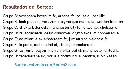 Lista de participantes: real madrid cf, barcelona cf, villarreal cf, manchester city fc, chelsea fc, manchester united fc, tottenham hotspurs fc, ac milan, as roma, juventus fc, borusia dortmund, bayern munich, losc lille, olympique marseilla, fc twente, ajax amsterdam fc, fc porto, shaktark donesk, cfr cluj, rubin kazan, fenerberahe sk, olympiakos, msk zilina, rsl anderletch, celtic glasgown, fc coppenague, lech poznan, werden bremen, sl benfica, arsenal fc, sc lazio, valencia fc.