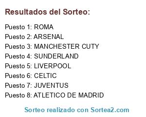 Lista de participantes: SUNDERLAND, ROMA, LIVERPOOL, JUVENTUS, CELTIC, ATLETICO DE MADRID, MANCHESTER CUTY, ARSENAL.