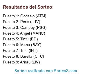 Lista de participantes: Angel (MANC), Peris (JUV), Barella (CFC), Trist (INT), Tintu (BD), Arnau (LIV), Gonzalo (ATM), Manu (BAY), Campoy (PSG).