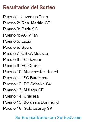 Lista de participantes: Real Madrid CF, FC Barcelona, Málaga CF, FC Bayern, Borussia Dortmund, FC Schalke 04, AC Milan, Juventus Turin, Lazio, Chelsea, Manchester United, Spurs, FC Oporto, Paris SG, Galatasaray SK, CSKA Mouscú.