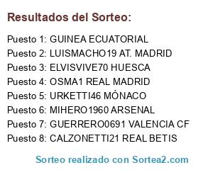 Lista de participantes: GUERRERO0691 VALENCIA CF, ELVISVIVE70 HUESCA, LUISMACHO19 AT. MADRID, GUINEA ECUATORIAL, CALZONETTI21 REAL BETIS, OSMA1 REAL MADRID, URKETTI46 MÓNACO, MIHERO1960 ARSENAL.