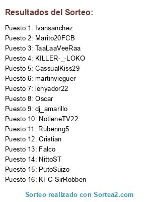 Lista de participantes: NittoST, TaaLaaVeeRaa, NotieneTV22, KILLER-_-LOKO, Rubenng5, PutoSuizo, KFC-SirRobben, Marito20FCB, Ivansanchez, lenyador22, dj_amarillo, CassualKiss29, Cristian, Oscar, Falco, martinvieguer.
