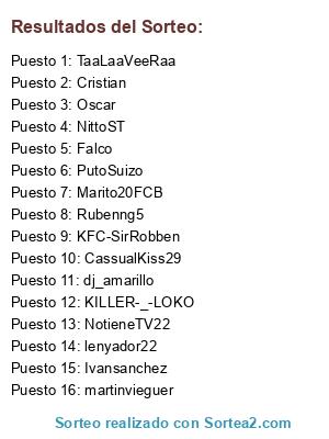 Lista de participantes: NittoST, TaaLaaVeeRaa, NotieneTV22, KILLER-_-LOKO, Rubenng5, PutoSuizo, KFC-SirRobben, Marito20FCB, Ivansanchez, lenyador22, dj_amarillo, CassualKiss29, Cristian, Oscar, Falco, martinvieguer.
