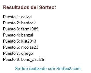 Lista de participantes: boris_azul25, orregol, deivid, bardock, nicolas23, banzai, farm1989, kist2013.