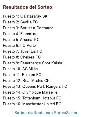Lista de participantes: Olympique Marseille, Fulham FC, Manchester United FC, Juventus FC, Fenerbahçe Spor Kulübü, Real Madrid CF, Galatasaray SK, Sevilla FC, Arsenal FC, Chelsea FC, Tottenham Hotspur FC, Queens Park Rangers FC, Borussia Dortmund, FC Porto, Fiorentina, AC Milán.