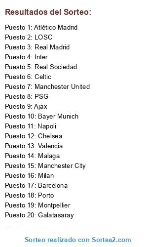 Lista de participantes: Atlético Madrid, Ajax, Anderlecht, Arsenal, Barcelona, Bayer Munich, Benfica, Braga, Celtic, Chelsea, Dortmund, Galatasaray, Inter, Juventus, LOSC, Liverpool, Malaga, Manchester City, Manchester United, Milan, Montpellier, Napoli, Nordsjaelland, Olympiacos, Porto, PSG, Real Madrid, Real Sociedad, Schalke, Sparta Moskva, Valencia, Zenit.