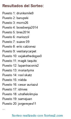 Lista de participantes: cesar auriazul, morro26, xgoku kai, samejuan, idrives, bossbenja2014, luispichin27, niidda, jorgereyes11, tejeda22, xavitrujillo95, xxjakethedogxx0, drunksmile9, rodrigowapo, oskr anuhar, magik taquito, eriic calzonez, mariozzil, suave 09, orlando06one, thestone27, moriartymx, vestiarycarpet, barupski, lapantraconis2, hache11, um insanity, gdk xalfax, pulidomx73, utrafielolimpia, rool skatz, bres2014.