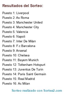 Lista de participantes: Paris Saint Germain, Liverpool, Juventus De Turin, Arsenal, Manchester City, Real Madrid, Chelsea, Napoli, Tottenham Hotspurt, Inter De Milan, F.c Barcelona, Ac Milan, Valencia, As Roma, Manchester United, Bayern Munich.