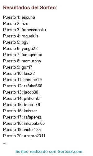 Lista de participantes: kaisser, gorri7, azapro2011, bubo_79, cheche19, fumajemba, inkapatxi65, jacob90, javivale, luis22, mcmurphy, francismosku, pitiflombi, rafarizo, rizo, rafuka666, roqueluis, rafaperez, selinichev, escuna, victor135, voodoo_bcn, yonga22, pgv.