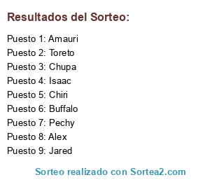 Lista de participantes: Chiri, Buffalo, Chupa, Amauri, Toreto, Alex, Jared, Pechy, Isaac.