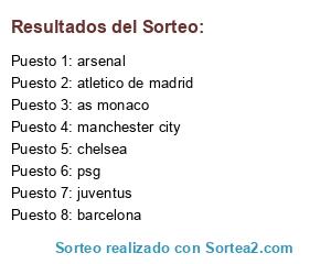 Lista de participantes: chelsea, arsenal, as monaco, juventus, atletico de madrid, psg, barcelona, manchester city.