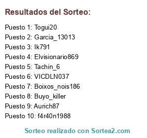 Lista de participantes: Togui20/Garcia_13013, VICDLN037, Buyo_killer, Elvisionario, f4r40n1988, Jugador de champions.