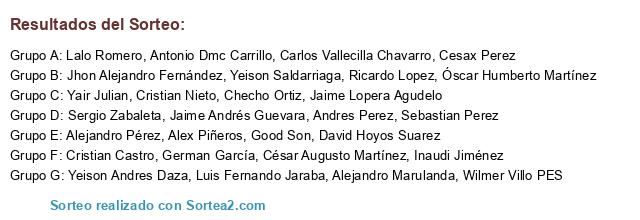 Lista de participantes: David Hoyos Suarez, Sebastian Perez, Cristian Castro, Yeison Andres Daza, Cesax Perez, Good Son, Yair Julian, Andres Perez, Cristian Nieto, Yeison Saldarriaga, Ricardo Lopez, Checho Ortiz, Luis Fernando Jaraba, Alex Piñeros, Lalo Romero, Jhon Alejandro Fernández, German García, Wilmer Villo PES, Alejandro Pérez, Antonio Dmc Carrillo, Jaime Andrés Guevara, César Augusto Martínez, Alejandro Marulanda, Carlos Vallecilla Chavarro, Óscar Humberto Martínez, Inaudi Jiménez, Jaime Lopera Agudelo, Sergio Zabaleta.