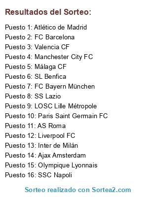 Lista de participantes: FC Barcelona, FC Bayern München, Manchester City FC, Liverpool FC, SS Lazio, Olympique Lyonnais, SSC Napoli, AS Roma, Paris Saint Germain FC, SL Benfica, Málaga CF, Valencia CF, Atlético de Madrid, LOSC Lille Métropole, Ajax Amsterdam, Inter de Milán.