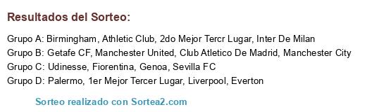 Lista de participantes: Sevilla FC, Athletic Club, Club Atletico De Madrid, Getafe CF, Palermo, Inter De Milan, Genoa, Fiorentina, Udinesse, Manchester City, Manchester United, Birmingham, Everton, Liverpool, 1er Mejor Tercer Lugar, 2do Mejor Tercr Lugar.
