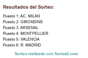 Lista de participantes: VALENCIA, R. MADRID, ARSENAL, MONTPELLIER, GIRONDINS, AC. MILAN.