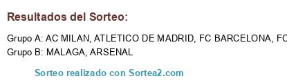 Lista de participantes: ARSENAL, MALAGA, ATLETICO DE MADRID, FC ZWOLLE, FC BARCELONA, AC MILAN.