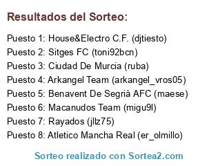 Lista de participantes: Benavent De Segrià AFC (maese), Macanudos Team (migu9l), Sitges FC (toni92bcn), House&Electro C.F. (djtiesto), Rayados (jllz75), Ciudad De Murcia (ruba), Arkangel Team (arkangel_vros05), Atletico Mancha Real (er_olmillo).