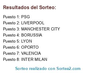 Lista de participantes: VALENCIA, MANCHESTER CITY, INTER MILAN, LYON, LIVERPOOL, PSG, BORUSSIA, OPORTO.