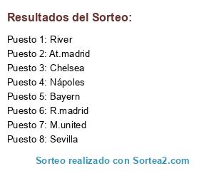 Lista de participantes: River, At.madrid, R.madrid, Bayern, Chelsea, Sevilla, M.united, Nápoles.