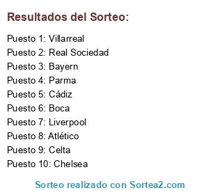 Lista de participantes: Villarreal, Atlético, Parma, Celta, Boca, Bayern, Real Sociedad, Cádiz, Liverpool, Chelsea.