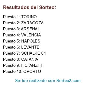 Lista de participantes: ARSENAL, ZARAGOZA, NAPOLES, CATANIA, LEVANTE, SCHALKE 04, TORINO, F.C. ANZHI, OPORTO, VALENCIA.