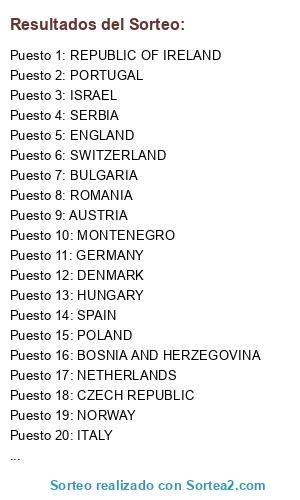 Lista de participantes: ITALY, SPAIN, ROUMANIA, GERMANY, NETHERLANDS, ENGLAND, PORTUGAL, DENMARK, SWITZERLAND, AUSTRIA, ISRAEL, POLAND, CZECH REPUBLIC, CROATIA, HUNGARY, BULGARIA, NORWAY, BOSNIA AND HERZEGOVINA, REPUBLIC OF IRELAND, SERBIA, MONTENEGRO.