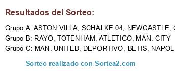 Lista de participantes: ATLETICO, DEPORTIVO, BETIS, GETAFE, ASTON VILLA, RAYO, TOTENHAM, NEWCASTLE, SCHALKE 04, NAPOLES, MAN. UNITED, MAN. CITY.