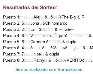 Lista de participantes: 1️⃣Alej &🔥The Big J. R, 2️⃣Emi 💕 & ═ᒪΣӨ═, 3️⃣Pathy & 💫VERITO💫, 4️⃣🆂🅾🅻🌸✨ & M@RY, 5️⃣Jona&Chinomarco, 6️⃣Carmen 💞 & dupla, 7️⃣Noe & dupla, 8️⃣V̫̫ꫀr͜͡ó̸ꪀįc͎𝐚 ̫̫ & ʜ.ᴠɪᴄᴛᴏʀ.