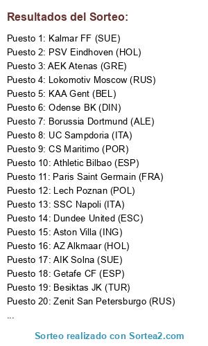 Lista de participantes: Juventus (ITA), Manchester City (ING), Lokomotiv Moscow (RUS), Lech Poznan (POL), Athletic Bilbao (ESP), Bayer Leverkusen (ALE), AIK Solna (SUE), FK Austria Viena (AUT), Sporting Lisboa (POR), Lille OSC (FRA), Kalmar FF (SUE), KAA Gent (BEL), Villarreal CF (ESP), Club Brujas (BEL), Montpellier HSC (FRA), PAOK (GRE), AZ Alkmaar (HOL), Feyenoord (HOL), CS Maritimo (POR), Grashopper CZ (SUI), CSKA Moscú (RUS), US Palermo (ITA), Galatasaray (TUR), FC Lausanne Sport (SUI), Zenit San Petersburgo (RUS), Bohemian FC (IRL), AEK Atenas (GRE), Aston Villa (ING), VFB Stuttgart (ALE), Getafe CF (ESP), Odense BK (DIN), BSC Young Boys (SUI), PSV Eindhoven (HOL), UC Sampdoria (ITA), Brondby IF (DIN), Fenerbahce SK (TUR), Sevilla FC (ESP), Paris Saint Germain (FRA), Borussia Dortmund (ALE), Dundee United (ESC), Liverpool (ING), Celtic (ESC), SSC Napoli (ITA), FC Utrecht (HOL), FC Porto (POR), Besiktas JK (TUR), Trabzonspor (TUR), Rapid Viena (AUT).