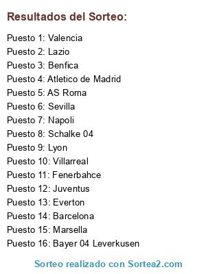 Lista de participantes: Schalke 04, Valencia, Everton, Fenerbahce, Bayer 04 Leverkusen, Atletico de Madrid, Lazio, Barcelona, Benfica, Villarreal, Marsella, Juventus, Napoli, Lyon, AS Roma, Sevilla.