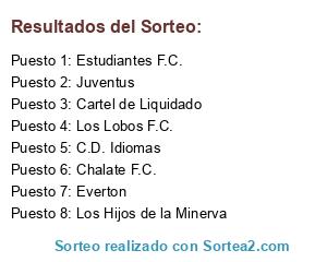 Lista de participantes: Cartel de Liquidado, Chalate F.C., Los Hijos de la Minerva, C.D. Idiomas, Estudiantes F.C., Juventus, Los Lobos F.C., Everton.