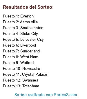 Lista de participantes: Liverpool, Totenham, Everton, Newcastle, Stoke City, Swansea, West Ham, Aston villa, Southampton, Leicester City, Crystal Palace, Watford, Sunderland.