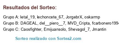 Lista de participantes: letal_19, fcarbonero1994, lechoncete_67, JorgebrX, Jmantin, DAGEAL, Emijuansolo, MVD_Cripta, Caosfighter, Shevagol_7, del__piero__7, oskarmp.