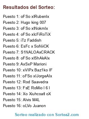 Lista de participantes: AxSxP Marioni, oFSo xIRubenIx, xVIPx Baz1ko IF, S1NALOAxCRACK, Alvis M4L, FsE RoMio l 6 l, oFSo xIJorgeAIx, Hugo king 007, Xo Xiuhcoatl oX, Rod Saavedra, EsFc x SoNiiCK, oFSo xINokmIx, oFSo xIShAkAIx, oFSo xIcFiRoTiX, oLVo Juanon, iTz Faddish.