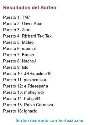 Lista de participantes: Oliver Atom, Pablo Carranza, lolo, Fatiga94, ignacio, NachoJ, JRRiquelme10, motleyrock, Braian.-, TM7, Mateo, rubenal, Richard Tex Tex, Zero, pablocaslaa, el7deespaña.