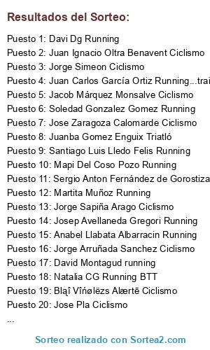 Lista de participantes: Ach Flpin Ciclismo ,trail y running, Adrià Grau Rovira Running - Trail, Adrián García Ramírez Ciclismo, Adryan Ors Macian Running, Aitor Calvo Bañuls Ciclismo, Alberto Rueda Rocher Running, Alberto Simó Ciclisme..Gràcies, Alberto Towers Triatlón, Alejandro Galvez Aguilera Maratón, Alejandro Palma Castro Running, Alex Mola Running, Alex Solana Triatlón, Alexa Torresano Giner Running, Alexander D'Elía Martín Ciclismo, Alfonso Alfonsito Ciclismo, Alicia Vila Perez Ciclismo, Almudena Venndrell Rebull Runin, Alvaro Dis Run running, Álvaro Sabater Ramírez Triatlon, Amador Martinez Sanchis RUNNING, Ambrosio Soriano Salines Triatlon, Amparo Canet Estornell Running, Amparo Vidal Running, Anabel Llabata Albarracin Running, Ángel MF Running, Angel Rodriguez Running, Angela Ferrando Garcia Running, Antonio del Pino Ciclismo, Antonio Diaz Perejon Ciclismo, Antonio Pérez García Running, Antonio Vte Arnau Pérez Running., Arcadio Serrano Ten Ciclismo y gracias, Bel Clari Participo!Running, Belén Estelles Belmonte Running, Bląî Vîńølëzs Alærtē Ciclismo, Borja Climent Sabater Triatlon, Campayo Arenas Isivicky Ciclismo, Carles Lopez Ciclismo, Carles Soler Sanchis Atletismo, Carlos Gr Ciclismo, Carlos Lorente Arroyo running, Carlos Moreno triatlon, Carlos Plantado Muñoz Correr, Carolina Puig Salom Ciclismo, Cesar Cn Ciclismo, Charly Martinez Gomez Triatlon., Chicote Jose Cuclismo, Christiane Wein Running, Clara Vendrell Running, Cris Tofol Trail, Cristina Micó Mascarós Running, Cristina Romeu Santamaria Ciclismo, Dani Marquez Martinez Ciclismo, Dani Redon Sol Diego Gómez Benítez, Dani Soler Triatlón, Daniel IResmés Running, Danielo Vazquez Triatlón, Davi Dg Running, David Bosch Nadal Triatlon, David Montagud running, David Montilla Cerdan Mtb, David Mutes Running, David Navarro Running, David Romero Muñoz Running, David Verbeneta Ciclismo, Diego Ferrero Torró Ciclismo, Diego Lozano Nogales Ciclismo.., Eduardo Cabañas Ciclismo, Eduardo Medina Moncho Ciclismo, Eduardo Provinciales García Ciclismo, EL Tatoo Cortes Trailrunning, Elena Madalena Running trail, Eljava Herrero Trail runnig, Emilio Alcañiz Garcia Triatlon, Ernesto Bargues Ciclismo, Espe Sanchis Running, Esteban Buitrago Calatayud Running, Eva Soler Running, Evaristo Bisbal Ciclismo, Fernando Andres Pacheco Running, Fernando Martinez Lerma Ciclismo., Fernando Tomás Bueso Running, Ferry Eslava Running, Fran Eyl Running, Fran Montagut Canet Running, Francis Calero Gimenez Running, Francisco Morella Ciclismo, Francisco V. Martinez Diaz Running, Frank Saubà Pérez Ciclismo, Guillermo Bellvis Julia Running, Hector Calabuig Calabuig Running, Hector Mateu Vidal Triatlon, Helen Salom Para Dani San San ciclismo, Ignacio Menor Navarro triatlon, Israel De Paco Lopez Ciclismo, Ivan Estruch Vercher Running, Ivan Garcia Leyva Ciclismo, Ivan Sanz Juan Running, Ivan Torres Huguet Ciclismo, Ivan V Peris Ciclismo, Ivana Abreu Sanchez Triatlón, Jacob Márquez Monsalve Ciclismo, Jacqueline SD Triatlón, Jaime Jimenez Running, Jaime Oltra Benavent Running, Jaume Albarañez Atletismo, Jaume Escuriet Aparicio Ciclismo, Javi Micó Sanz Running, Javi Ródenas González Triatlón, Javier Borderia Durán Running, Javier Francés Ciclismo, Javier Galindo Rodríguez Running, Javier Gómez Ciclismo, Javier Gonzalez Lara Triatlon, Javier Mengual Gozalbez Running, Javier Ortola Julia Running, Javier Sandalinas Running!!, Javier Valles Running, Joan Lema Mateo road i btt, Jordi Gandia Natación,trail, Jordi Masia Astruells Triatlon, Jordi MB Ciclismo, Jordi Rivera Margalejo Running, Jordi Salas Running, Jordi Svheco Ciclismo, Jorge Arruñada Sanchez Ciclismo, Jorge Coca Fernandez Ciclismo, Jorge Cuevas Ciclismo, Jorge FA Running, Jorge Garcia Sanchez Running, Jorge Medina Running, Jorge Mompó Barrachina Ciclismo, Jorge Moreno Gonzalez Triatlo, Jorge Sapiña Arago Ciclismo, Jorge Simeon Ciclismo, Jorge Vilar Ciclismo, Jose A. Fernandez Gomis Ciclismo, José Antonio Adelantado Martinez ciclismo, Jose Fernandez Jurado Ciclismo, Jose Ferrer running, José García Ciclismo, Jose Gimenez Ciclismo, Jose Girbes Running, Jose Luis Alario Puig Running, Jose Luis Marin Castellanos Triatlon, Jose Luis Mascarell Sanz Natacion, Jose Luis Soriano Zarzoso Running, Jose Mahiques Running, Jose Manuel Menendez Coto Rinning, Jose Maria Espada Duplas Running, José María Rodríguez Martínez Triatlón, Jose Miguel Huertas Navarro Ciclismo, Jose Pla Ciclismo, Jose Ruiz Running, Jose Saez Running, Jose Sánchez Romero Runing, Jose Vicente Machi Bisbal Running, Jose Xima Runing, Jose Zaragoza Calomarde Ciclismo, Josep Avellaneda Gregori Running, Josep Domingo Nieto Running, Josep Francesc Giner Dominguez Running, Josep Llorens Trailrunning, Josep MP Ciclismo, Josep Pastor Sillonbol, Joserra Rm Triatlon, JR Carlos Soler Triatlon, Juan Antonio Alabort Blay Ciclismo, Juan Antonio Guerrero Morilla Running, Juan Carlos García Ortiz Running...trail, Juan Iglesias Santacreu Running, Juan Ignacio Oltra Benavent Ciclismo, Juan Ramón Aranda Vaz Running, Juanba Gomez Enguix Triatló, Juanjo Fornes running, Juanjo Mañez Triatlon, Juanma Ferri Palop Ciclismo, Juanpa Sanchez Gomez Triatlón, Julio Peiró Balbastre Running, Kike Mas Castany Triatlón, Laura Cholbi Sellés Triatlon, Laura Sospedra Running, Leo Silvestre Diago Running en version trail, Lluis Ramirez Aliaga Ciclismo, Luis Olivares Yuste Running, Maca Canary Ciclismo, Majito Navas Triatlon, Mamen Martinez Pla Running, Manuel Gonzalez Milan Triatlón, Manuel Leal Linares Running, Manuel Sanchez Triatlon, Mapi Del Coso Pozo Running, Mar Ordoñez Fernandez Triatlón, Marc Benavent Running, Marcel Escrig Ciclismo, Marcos Lavara ciclismo, Marcos Portoles Running, Mari Carmen Vallés Soler M'encantaría. Jo practique el trail running. Gràcies!!!!, Mari Ordiñana Balbuena Ciclismo, Maria Eugenia Moscardo Ortiz Running, María Vicario Running, Maria Villalba Sais Running, Marien Claver Ortells 