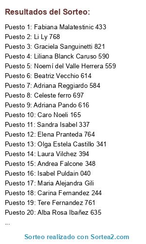 Lista de participantes: Andrea Falcone 348, Liliana Lascar 237, Ana Maria Garcia 999, Maria Julia Trapani 780, Maria Elena Evangelista 235, Carito Andy Tunez, Susana Vilchez 329, Mirta Foresi 631, Marina Pelaez, Graciela Liseras, Olga Estela Castillo 341, Liliana Blanck Caruso 590, Li Ly 768, Tamara Vazquez, Any'S Barrionew 081, Caro Noeli 165, Paola Barrozo 866, Laura 13 366, Liliana Beatriz Pezzutti 399, Monica Rodriguez 733, Stella Petruselli 880, Sandra Isabel 337, Alba Rosa Ibañez 635, Maria Alejandra Gili, Fabiana Malatestinic 433, Elena Pranteda 764, Franca Silvana Zappala 350, Adriana Pando 616, Rosita varon 110, Vanina varon 186, Gelita Varon 295, Isabel Puldain 040, Silvia Alejandra Fernandez 970, Beatriz Vecchio 614, Norma Galié 397, Celeste ferro 697, Maria Rosa Galie, Nancy Benitez 576, Norma Gonzalez 683, Gra Medina 869, Graciela Sanguinetti 821, Adriana Reggiardo 584, Patricia Belardinelli 737, Roxana Tricanico 786, Maria del Carmen Lobos 451, Lucrecia Solari 999, Julia Barrozo 430, Carina Fernandez 244, Min Laullian 322, Cari Castro 514, Susana Vilchez 320, Laura Vilchez 394, Lidia Natividad Alegre 169, Tere Fernandez 761, Myrian Farias 474, Noemí del Valle Herrera 559, Lorena Alejandra Devit 043, Graciela Borda 810, Estela del Carmen Urueña 197, Lili Godani 374, Luz Maria Maldonado 6632, Mirtha Artaza 309.