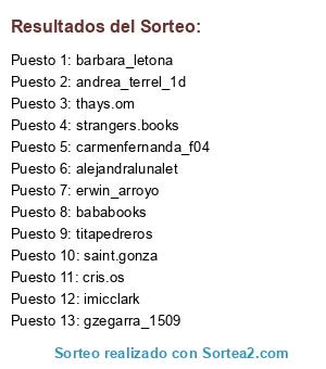Lista de participantes: thays.om, cris.os, erwin_arroyo, bababooks, titapedreros, imicclark, carmenfernanda_f04, barbara_letona, strangers.books, gzegarra_1509, andrea_terrel_1d, saint.gonza, alejandralunalet.