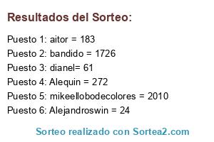 Lista de participantes: aitor__800 = 183, mikeellobodecolores = 2010, bandido_666_ = 1726, falcon_2605_ = 272, dianeli_1 = 61, danisuperr28 = 24.