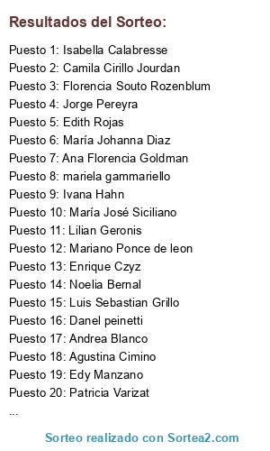 Lista de participantes: Sofía Lo Bruno, Sabrina Romero, Rosendo VianaR, Brian Centurion, Ivana Hahn, Sofia Tarnowski, Natalia Nuñez, Lucía Sumbaino, Lucía Firpo, Milena Gutierrez, Isabella Calabresse, Juan ignacio Puel, Ariel Arrebola, maitena astiz, Camila Peretti, Joan Agustín Valenzuela, Candela Chavez, Josefina andrea Moron, Noelia Totino, Nahuel Barreto, Candela Salaño, Ivan Julys, Agustina Steffen, Melina Celeste Mercado, Lorena Cano, María José Siciliano, Josefina Diez, Laura Quintana, Natalia Bussolino, Agustina Cimino, Ana Florencia Goldman, mariana barberio, María Florencia Bachellerie, David Gonzalez, Florencia Cano, Aylén Berza, Juan pablo Gelis, Gaston Smulevici, Joaquín Berger, Agustina Pérez Díaz, Rocio Panelo, Vanesa Alejandra Paz, Celeste Ratto, Simon prieto, Analia Maceras, Alicia nora Palisca, Gisela Lopez, Natalia Monzón, Celia Musich, Yesica Spadillero, Mariela Benante, Geraldine Seff, Veronica Guarino, Ivana Zapico, Valeria Assiz, Jimena Oliveri, Carolina Sternberg, mariela martinez, Jorge Pereyra, Martina Cabrera Cabrera, Carla Parodi, Brenda Ailén Lauriti, Maria Sandra Garcia, Edith Rojas, Laura Iannece, Victor Maidana, Madelaine Weber, Ana Garat, María Emilia Paini, YAMILA Rodriguez Foulon, Mariana Mitchelena, Maria Fernanda Robotti, Lucia Patane, Laura Cantu, Danel peinetti, Lorena Watson, Lorena Elizabeth López, Lidia Mata, Laura Faletty, Camila Cirillo Jourdan, Daniel Herrera Herrera, Veronica Romina Cavanna, Walter Canteruccio, Giuliana Manetto, Maria Rosa Delle Donne, Maria Fernanda Carrera, Patricia Schifini, monica ortega, Mariano Ponce de leon, Eugenia Grosclaude, Myrian Lomoro, Sergio Adrián Barreyra, María Laura Surachi, Patricia Trenti, Javiera Merlet Morales, Gabriela Orellano, Elba Monica Gimenez, Vanesa Cocco, Nancy Beneitez, Claudia Sbarra, Javier Marino, Cecilia Ledesma, valentina fonte, Paula Fernandez, Eugenia Gonzalez, Gaia Iris, Florencia Müller Ceretti, Carolina Orozco, Edy Manzano, Leandra Ledesma, Ludmila Aldariz, Silvina Marchetti, Rosario Garriz, Juan Alvarez, Cecilia Fernández, Yamila Marchevsky, Agustina Dreven, Samantha Soto, Susana De silvestre, Silvia Adriana MIGNOGNA, Enrique Czyz, Eliana Abeli, Florencia Abella, Vanesa Dalla Pozza, Carla Chistte Zurbrigk, Andrea Blanco, Viviana Mirta Lah Ukmar, Nailin Sternberg, Rubén López, Catalina Nahuel, Valeria Cattarozzi, Maria laura Moreno, Carolina Buegos, Marina seminara, Mariana Delle Donne, Gisselle Nicolosi, Carolina Andrea Zaniratto, Daniela Giannotti, Karen Medina, Constanza Valeria RIPARI, Gabriela Levato, Rou Barran, Viviana Andrade, Nicole Mc Gaw, Jorge Viera, SANDRA Masotta, Paz Damico, Daiana Cavanna, Daiana griselda Cavanna, Adriana Lasala, Bianca Ceccato, Ailen Barreyra, Mónica Victoria CALIGARIS, Fabiana Zabala, Luciana Luna, Marie Dajcz, Andrea Russo, Guillermo López de Bock, María Anahi Ercoli, Gabriela Caballero, Laura Candi, Jora Lambert, Maria Florencia Esperanza, Micaela Queirolo, Flavia Pagnotta, Bárbara Biglieri, Johanna Finguer, DIANA ESTEVEZ, Nadina Fiuza, Oriana Lopez, Leonardo Cano, Andrea Sandoval, Lucia Vallejo, María Johanna Diaz, Daniela Barbera, Florencia Neglia, Maria Calvi, Mariana Añon, María Fernanda Gómez Bazán, Marisa Lopez, Noelia Dos Santos, Eugenia Cordova, Yesica Petrasso, Lilian Geronis, Micaela Flores, María celeste Romero, Mara Trofimov, Karla Marcano, Francisca Jáuregui, Mariana Fernandez, Andrea Finocchietti, Dariana Jaurena, Yesica Fernandez, Priscila Cianni, Noelia Bernal, Silvia Veronica Cornejo, Kevin Veluscek, Jorgelina Ronzoni, Lucia Baumgart, Leandro Fabián Arguello, Mariano Javier González del Campo, Paula Nuncija, Cintia Morel, Cecilia Armas, Joaquin Augusto Gonzalez, Florencia Souto Rozenblum, Elisandro Bel, Sofia Cavallo esperanza, Gabriel CARAM, AGOSTINA CAREAGA, Caro Bohus, Maximiliano E Meza, Luis Sebastian Grillo, Julieta Cotta, mariela gammariello, Valentina Salerno, Natalia Cusano, Gustavo Barzala Vera, Augusto Rolin, Sharon RC, brisa fedi budzaj, Rosario Cerruti, Mabel Pomerantz, Rosana Casimiro, Nancy Figueroa, Gustavo Manuel Diaz, Cris Pilosio, Cecilia Jacome, Roberto Ruzzi, Viviana Irene Sanchez, Patricia Varizat, Marina Maceras, Ayelen yanina Garaventa, Julieta Ferrario, Sofia Errecalde, Bruno Tundis, Florencia Maiolo, Cintia Tacon, Pablo Cardos, Clara Oses, Liliana Tettamanti, Paola Andretta, Nicolas Corrales, Wendy Osorio, Carlos Esteban, Araceli Herrero, Melina Poma Alzamora, Laura Mendez, Cristian Ybarra, Andrea Fernández, Marina Juricich, Sharon Cohen, Natan Altamirano.
