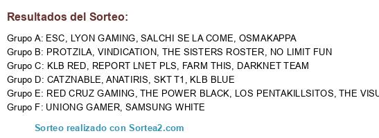 Lista de participantes: RED CRUZ GAMING, KLB BLUE, KLB RED, PROTZILA, ANATIRIS, OSMAKAPPA, FARM THIS, CATZNABLE, SALCHI SE LA COME, DARKNET TEAM, ESC, LOS PENTAKILLSITOS, THE VISUAL WARRIORS, THE POWER BLACK, THE SISTERS ROSTER, SAMSUNG WHITE, SKT T1, UNIONG GAMER, REPORT LNET PLS, NO LIMIT FUN, LYON GAMING, VINDICATION.