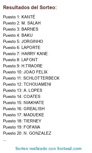 Lista de participantes: A. LOPES, LAFONT, COATES, LAPORTE, TIERNEY, H.TRAORE, NIAKHATE, FOFANA, SCHLOTTERBECK, TCHOUAMENI, THIAGO, JORGINHO, KANTÉ, MADUEKE, BARNES, BAKU, N. GONZALEZ, FIRMINO, JOAO FELIX, HARRY KANE, M. SALAH, GREALISH.
